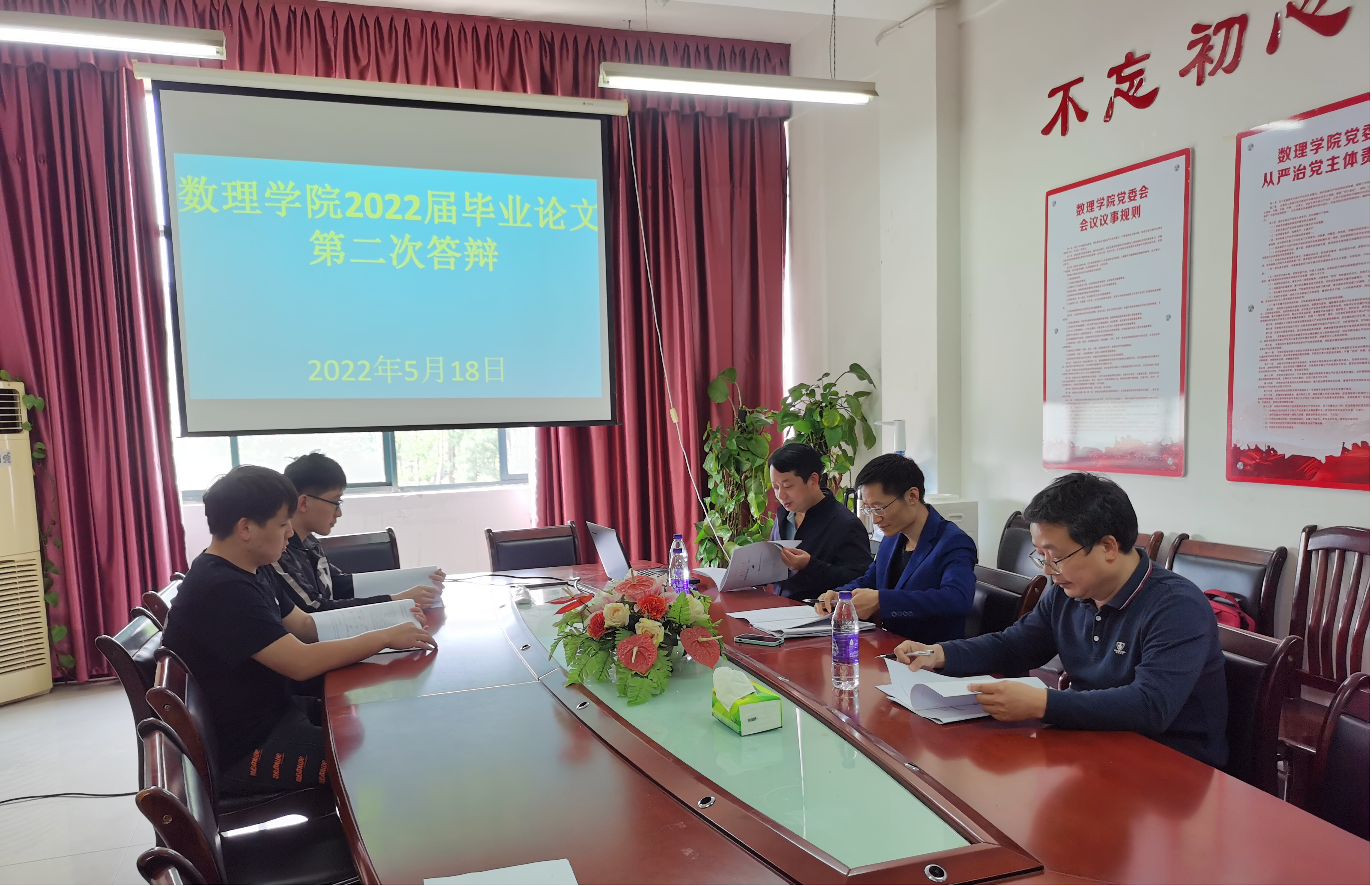 数理学院2022届毕业生论文答辩工作于5月14-15日进行,5月17-18日进行第一次未通过学生的二次答辩。学院有数学与应用数学(师范类)、物理学(师范类)、统计学和应用物理四个专业的250名学生参加毕业论文答辩,答辩分21个小组,共51名校内外专家参与了答辩评审工作。针对11位因特殊情况无法参加现场答辩的学生,学院采取在线方式进行毕业论文答辩。