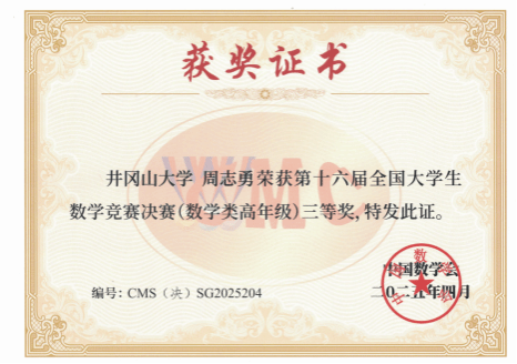 由中国数学会主办、浙江师范大学承办的第十六届全国大学生数学竞赛决赛于2025年4月11日至13日在浙江师范大学成功举行。经过重重选拔,本次决赛共有来自全国32个赛区的1246名同学入围我校2022级数学与应用数学(师范类)本2班周志勇同学代表井冈山大学江西赛区参加数学专业高年级组决赛,与来自包括北京大学、清华大学、浙江大学、复旦大学等在内各大高校的621名同学同台竞技,经沉着稳定的作答,不负众望,最终荣获了数学专业高年级组全国等奖的佳绩全国数学专业高年级组三等奖158名,江西赛区9名。这是我校在此项赛事中取得的历史性突破,创造了数学专业组参赛以来的最好成绩。