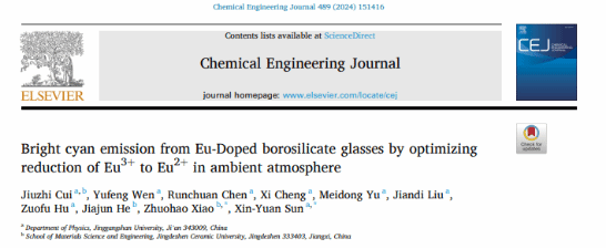 玻璃材料因其组份灵活、工艺简单、理化稳定性好等综合优势而成为解决“青光间隙”的一个重要参考方案。我校特种玻璃与光电材料研究团队在中科院一区、化工专业顶级期刊《Chemical Engineering Journal》(IF2023=15.1)上发表题为“Bright cyan emission from Eu-Doped borosilicate glasses by optimizing reduction of Eu3+ to Eu2+ in ambient atmosphere”的研究论文。项目研究团队基于竹炭和氮化硅(Si3N4)等固体还原剂的协调作用,采用二次高温熔融法成功获得了一种高效青色发光的Eu掺杂硼硅酸盐玻璃。获得的硼硅酸盐玻璃透过率为84 %,二价Eu2+最高含量为66.1%,最佳发射峰为486 nm,实现了高亮度的青光发射。该方法不需要传统还原气体实现铕离子还原,极大简化了玻璃的制备工艺并降低了相应的制备成本,为其它发光中心离子在空气中的高效还原提供了重参考价值。