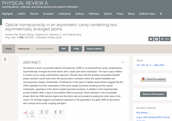 数理学院夏秀文博士团队在中科院二区期刊、理论物理专业顶级期刊《Physical Review A》上发表题为“Optical nonreciprocity in an asymmetric cavity containing two asymmetrically arranged atoms”的理论研究文章。