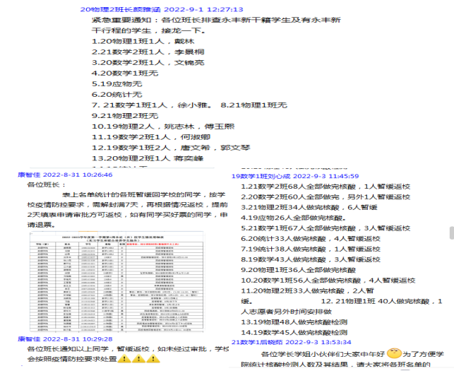 1. 加强宣传、及时布置,筑牢师生思想防线。自开学以来,学院通过8月28日教职工大会和班主任会议及后续校内外线上线下师生、班级会议,积极传达和宣传学校和属地疫情防控工作要求,及时转发全国疫情特别是吉安市疫情变化情况和防控措施,号召动员全院师生坚决执行学校疫情防控措施,提高思想认识、筑牢疫情防控思想防线。特别是在学校9月4日发出将进行“封闭式管理”措施后,学院党委书记积极组织学院相关领导、干部,特别是三位辅导员第一时间携带生活必需品进校办公住宿。