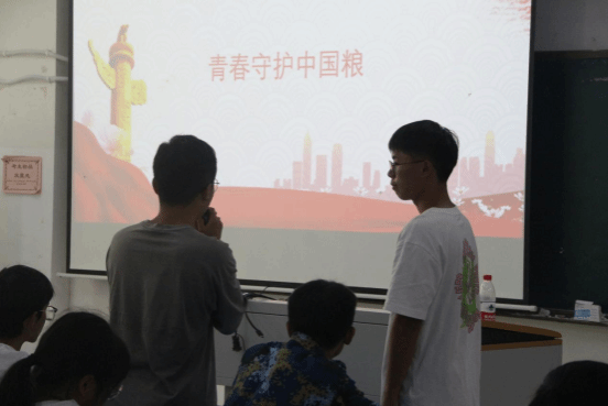 汇报人舒凯通过介绍习近平新时代中国特色社会主义思想的核心要义和主要特点带领大家学习了解《习近平新时代中国特色社会主义思想学习纲要》,指出习近平新时代中国特色社会主义思想具有鲜明的时代性、人民性、科学性和实践性。 并以观看视频的形式让同学们深入理解习近平新时代中国特色社会主义思想的核心要义,增强了同学们对习近平新时代中国特色社会主义思想的认识。此外,他还要求同学们学习习近平总书记最新重要讲话、重要文章,倡导大学生用青春守护中国粮。同学们纷纷表示,将知行合一,用实践践行“节粮为荣,浪费可耻”的理念。