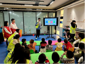 在经过简单的自我介绍后,志愿者们以一首欢快的儿歌作为暖场与小朋友进行互动。小朋友们被大家的热情所感染,纷纷跟着节奏摇摆身体,现场气氛瞬间活跃起来。