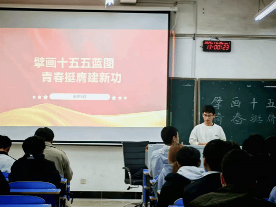 为引导广大团员青年深入学习贯彻党的二十届四中全会精神,准确把握“十五五”规划的核心部署与实践要求,切实将思想和行动统一到国家发展战略上,数理学院于11月10日上午在10A015教室举办了以“擘画十五五蓝图,青春挺膺建新功”为主题的团日活动。本次活动由数理学院团委组织部工作人员谢洪轩主持,各班级团支部学生代表参与。