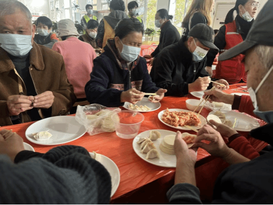 随着居民们陆续到场,包饺子环节正式拉开序幕。大家围坐在桌案旁,志愿者与居民们自由组队,相互协作。包制过程中,志愿者们有条不紊地执行着维持现场秩序、分发物料、协助年长居民等服务工作。以实际行动践行“奉献、友爱、互助、进步”的志愿精神。