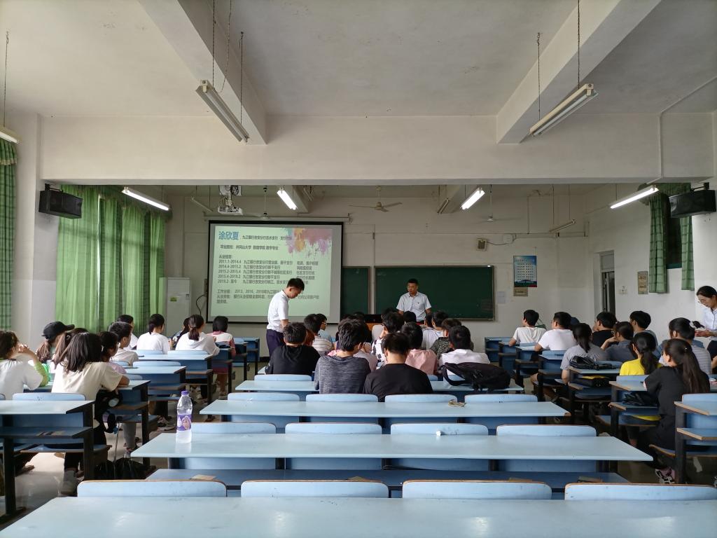 5月13日下午,数理学院邀请2011届优秀毕业校友、九江银行吉水县分行行长涂新厦来院为学弟学妹做就业创业公益讲座。涂新厦校友结合自己在校期间学习、成长过程和工作求职锻炼提升经历从当前的就业形势、找到一份满意工作需要储备哪些技能、就职过程中应该具备哪些技能等三个方面跟学弟学妹进行分享。涂新厦校友从自己个人成长的真实经历,毫无保留的向学弟学妹诠释做人、做事道理,为大家做好职业生涯规划指点迷津,带来了一场丰盛的精神盛宴!