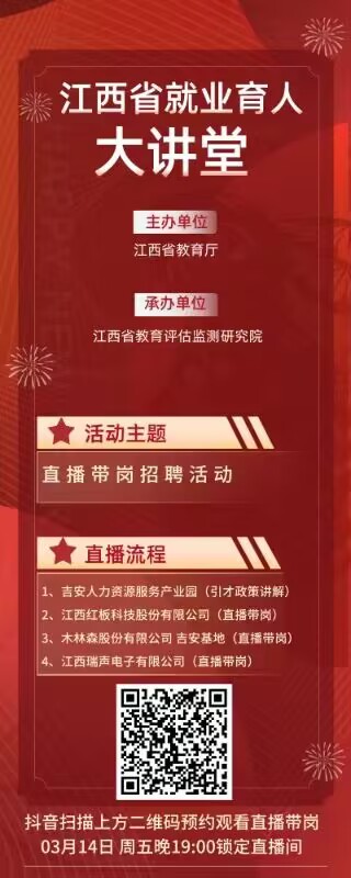 本期就业育人大讲堂将于3月14日(周五)晚上19:00开播,特邀吉安人力资源产业园为同学们讲解引才政策,江西红板科技、木林森股份有限公司、江西瑞声电子有限公司进行直播带岗,本次就业育人大讲堂是我校首次承办。
