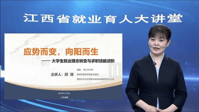 为进一步引导学生树立科学就业观,提升求职竞争力,11月7日在十栋A006,数理学院组织学生线上观看江西省就业育人大讲堂第一期专题讲座。本期讲堂特邀南昌大学教授、博士生导师邱璟担任主讲人,以《应势而变,向阳而生——大学生就业理念转变与求职技能进阶》为题,为学子们带来了一场干货满满的就业指导课。