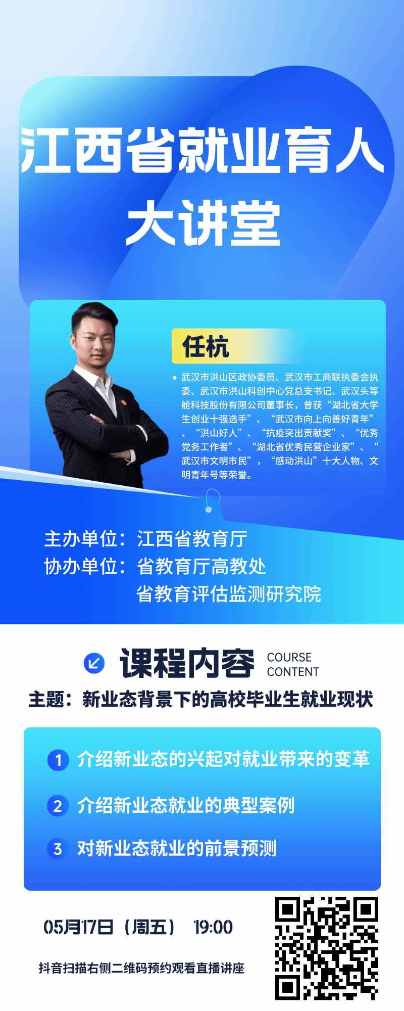 2024届江西省就业育人大讲堂第二十三期将于本周五晚上(5月17日)19:00开讲,本期特邀武汉市洪山区政协委员、武汉头等舱科技股份有限公司董事长任杭围绕《新业态背景下的高校毕业生就业现状》作专题授课,请各班级组织本院师生准时上线观看。