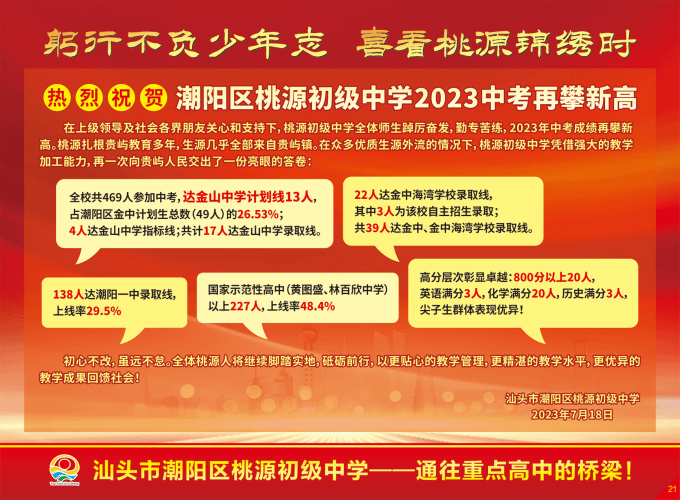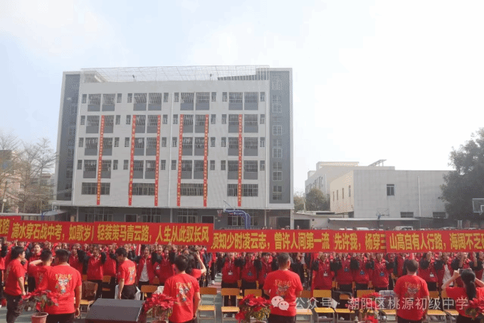 汕头市潮阳区桃源初级中学是2016年经潮阳区教育局批准成立的标准化民办初级中学。 学校位于汕头市潮阳区贵屿镇,占地20余亩,建筑面积近20000平方米,设计规模为26个教学班,在校学生1200多人,专任教师80多人。学校按市一级标准配备教室及各种功能场室,学校教学、生活、运动等设备设施先进齐全。自办学以来共有6届中考,考取金山中学(广东六强)130余人,考取潮阳一中近800人,中考重点高中升学率在汕头市名列前茅,在潮阳区稳居前三。学校师资力量雄厚,教研团队强大,能让青年教师的教育教学能力迅速提升,让每一个应届毕业生都得到快速成长和最好的发展。学校以创建汕头市一流初级中学为目标,把"以人为本、全面育人"作为宗旨,努力让每个孩子都实现考取理想高中的梦想!
