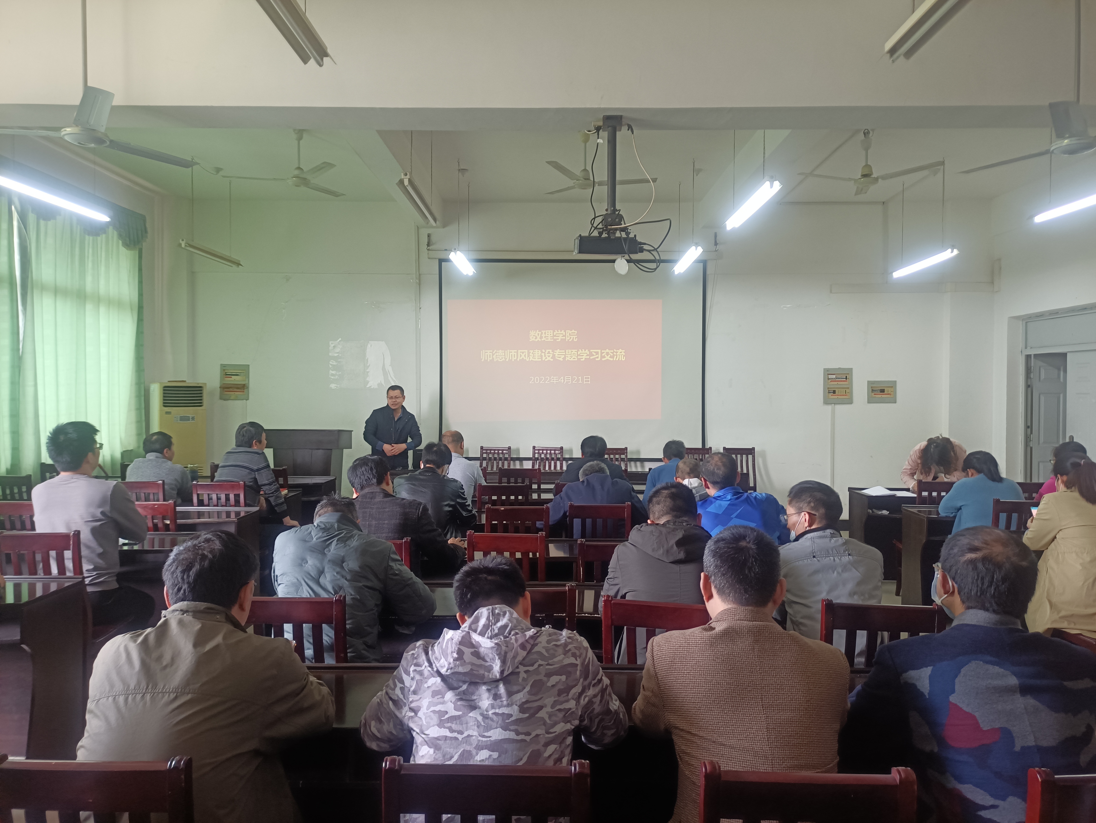 4月21日下午,数理学院开展师德师风建设专题学习会,学习首都师范大学教师工作部部长兼教师发展中心主任苏寄宛教授的课件《新时代高校师德建设的形势与任务》和《江西省科研诚信信息管理暂行办法》。学院全体教职工参加学习,孙心瑗副院长领学并讲解。系副主任和教师代表作学习体会发言。