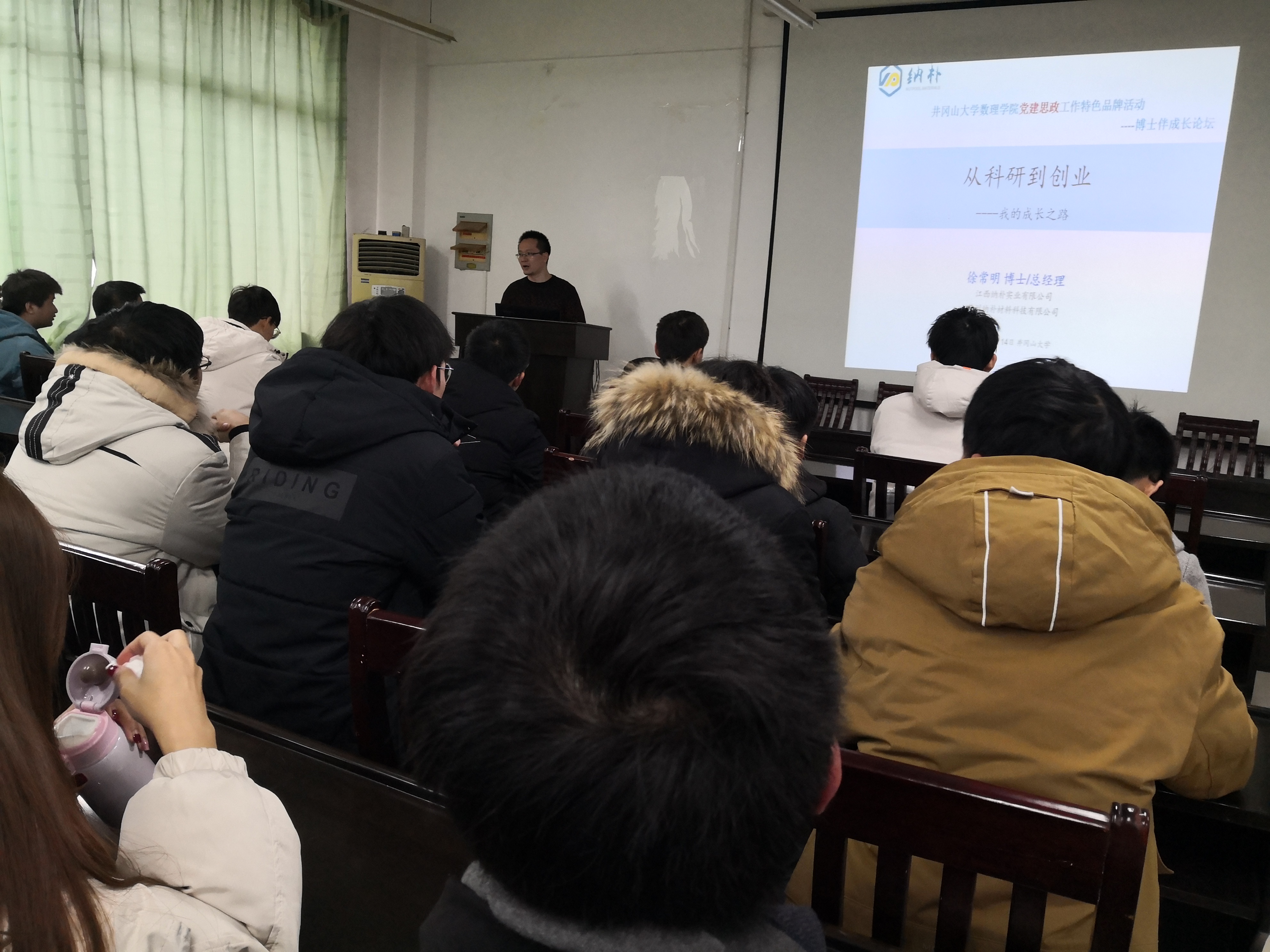 12月14日下午,数理学院在10栋A302室举办了“博士伴成长大讲坛”活动,此活动为学院党建思政品牌活动,至今已举办了六期。此次活动的主讲嘉宾为上海纳朴创新科技有限公司总经理、学院客座教授徐常明博士,共计80余名师生参加活动。