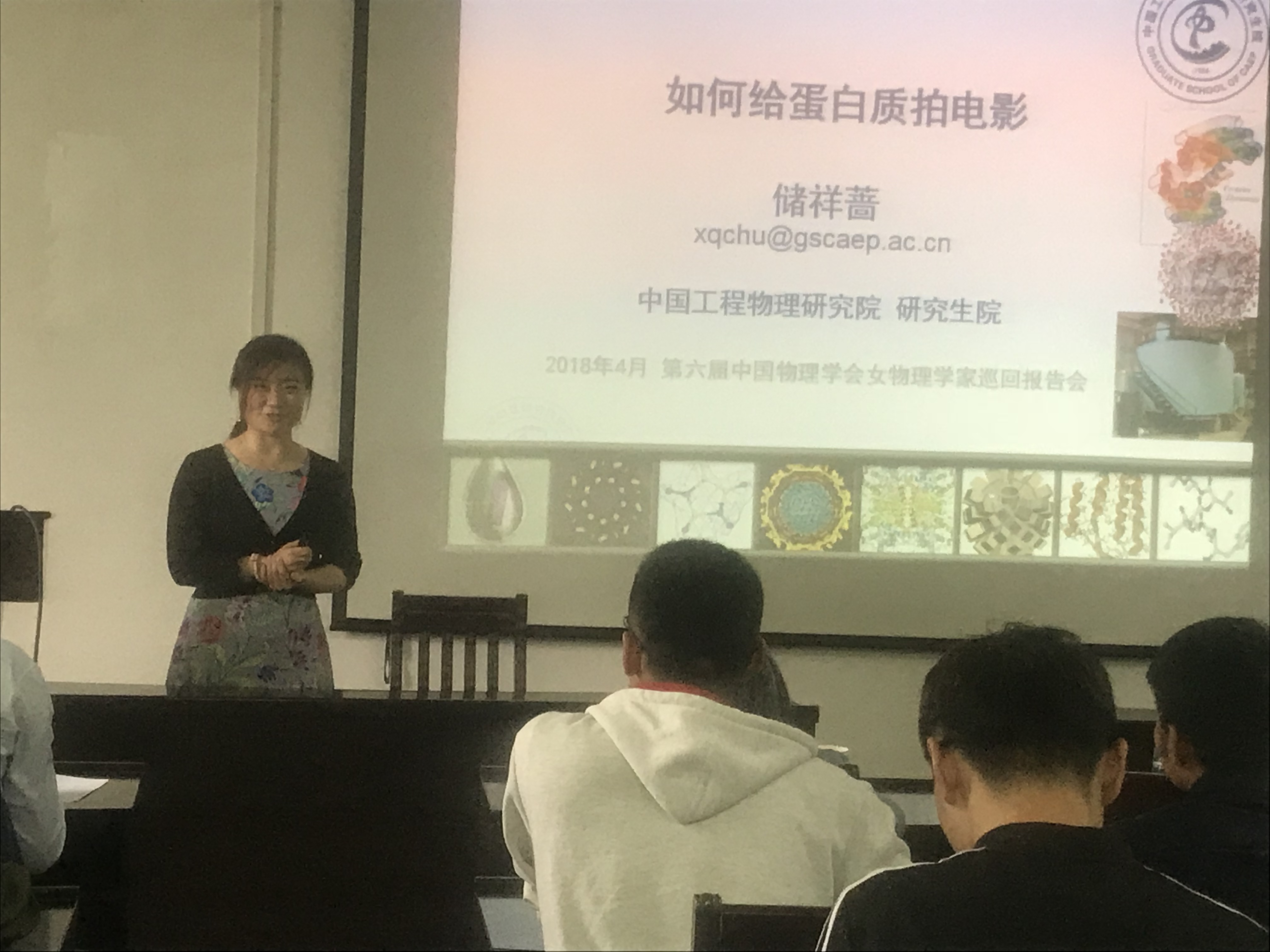 2018年4月26日,第六届中国物理学会著名女物理学家一行7人来到我校作巡回报告会。她们中有中国科学院物理研究所吴令安研究员/博士生导师/中国科学院大学教授、厚美瑛 研究员/博士生导师、北京工业大学固体所隋曼龄教授/博士生导师、中国工程物理研究所研究生院储祥蔷研究员/博士生导师、贵州大学物理系胡林教授/博士生导师、《物理学报》、《物理》编辑部王进萍编辑。