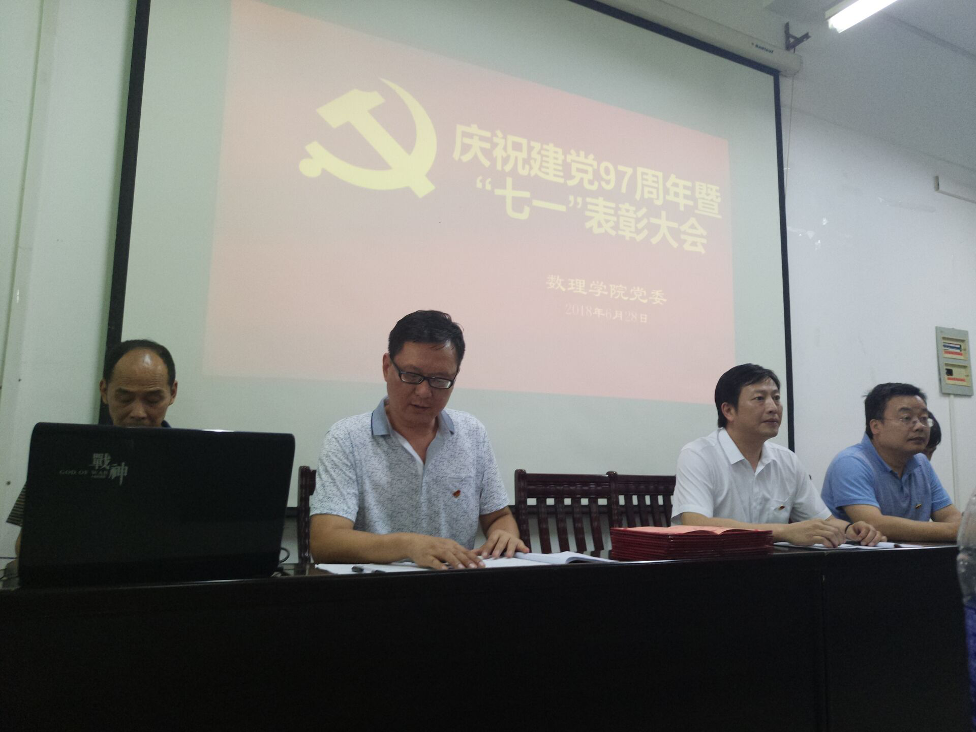 2018年6月28日下午,数理学院党委在10栋A302举行庆祝中国共产党建党97周年暨“七一”表彰大会,表彰先进党支部、优秀共产党员、优秀党务工作者和学生党员标兵,并进行“七一”入党宣誓仪式。学院党委书记王剑出席会议并讲话,会议由党委副书记宋耀东主持,学院领导刘忠东、胡强林、王新长出席会议,各支部书记、全体学生党员和教工党员出席了会议。