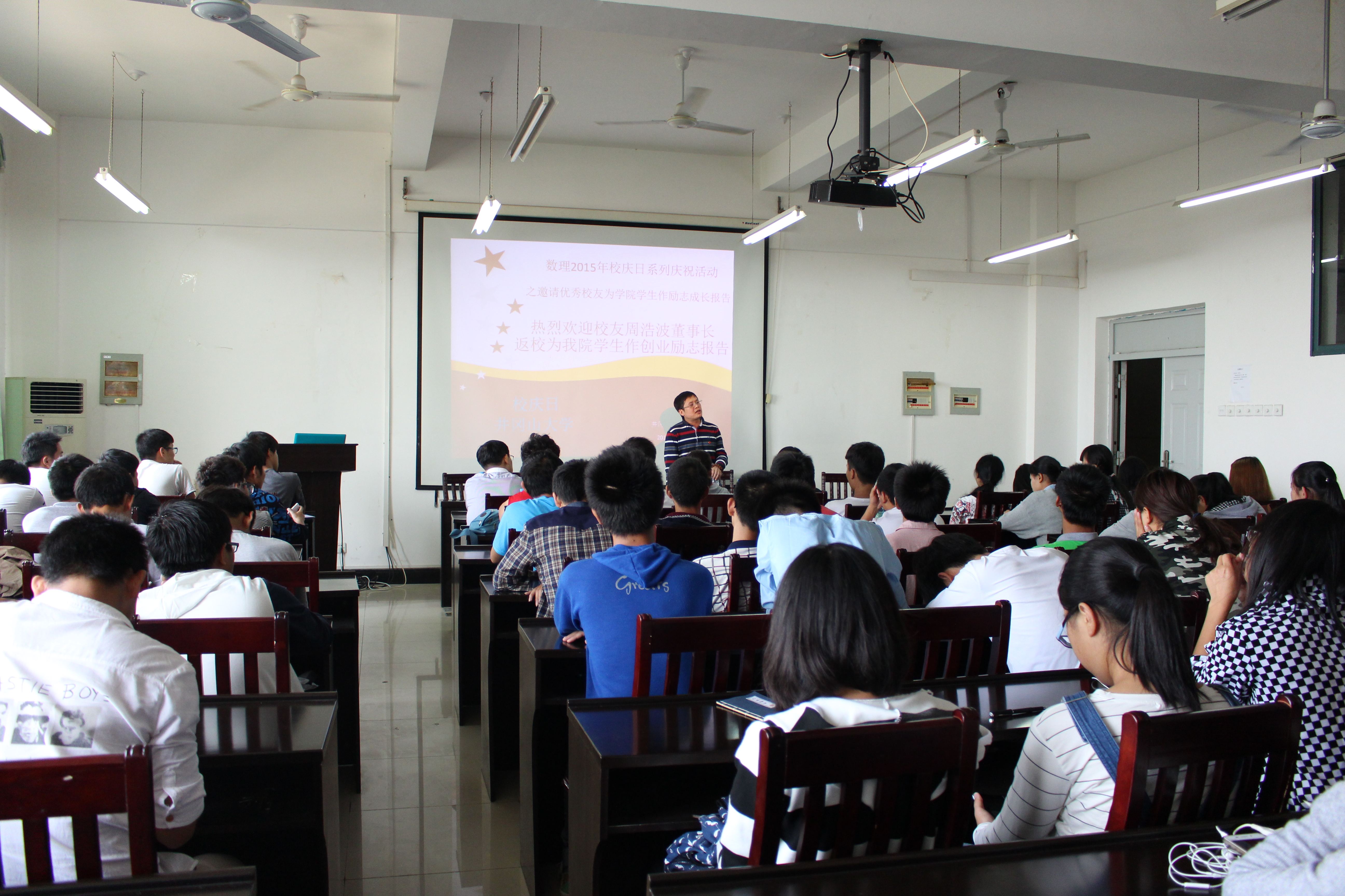 2015年10月28日下午,数理学院邀请了浩博教育集团董事长、“2007中国教育管理十大杰出人物”、91届物理系校友周浩波为学院学生作创业励志报告。报告会由院党委书记钟风健主持。