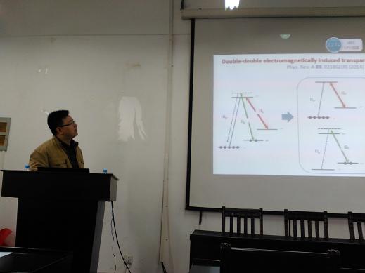 朱成杰教授深入浅出的阐述了电磁诱导透明以及拉曼增益的相关原理并向大家介绍了该领域的研究进展。通过与在场师生分享自身的研究经历,朱成杰教授带领大家进一步了解了该领域的研究热点,而朱教授对于自身研究思路的阐述更是引起了在场师生们的广泛兴趣。整场报告持续了近一个小时,现场气氛十分热烈。