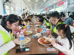 上午十一点五十,志愿者带着孩子们来到井大学生餐厅一对一用餐。志愿者精心为孩子们选菜,孩子们开心地说:“哇,有鸡腿,我喜欢吃鸡腿”。打好饭菜,志愿者和孩子面对面坐着边吃饭边交流,交流孩子们在生活和学习中遇到的一些问题,志愿者进行指导。志愿者们还告诉小朋友们不能浪费粮食,不能挑食,让小孩子养成良好的习惯。彭梦媛小朋友:“我好喜欢这次活动,也好喜欢老师们和大哥哥大姐姐们,想下次再来!”